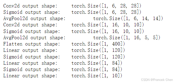 的单通道(黑白)图像通过LeNet。通过在每一层打印输出的形状,我们可以检查模型,以确保其操作与我们期望的图2一致。