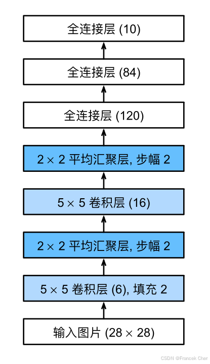 卷积核导致的特征减少。相反,第二个卷积层没有填充,因此高度和宽度都减少了4个像素。随着层叠的上升,通道的数量从输入时的1个,增加到第一个卷积层之后的6个,再到第二个卷积层之后的16个。同时,每个汇聚层的高度和宽度都减半。最后,每个全连接层减少维数,最终输出一个维数与结果分类数相匹配的输出。