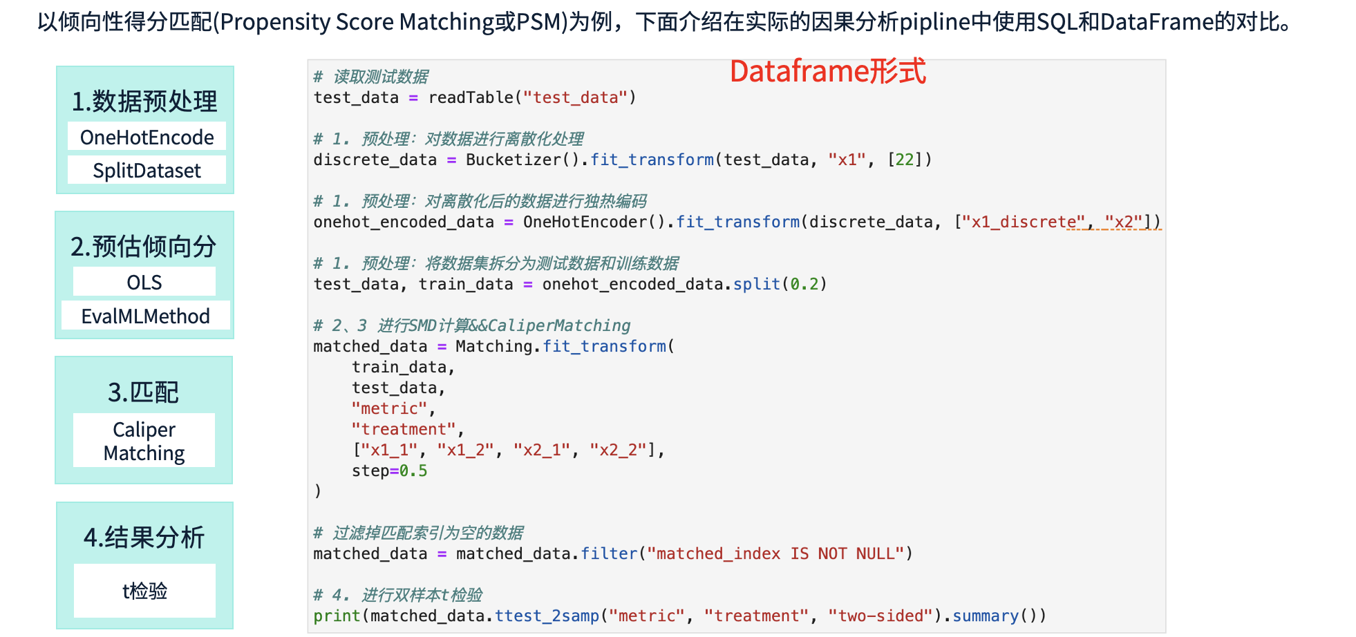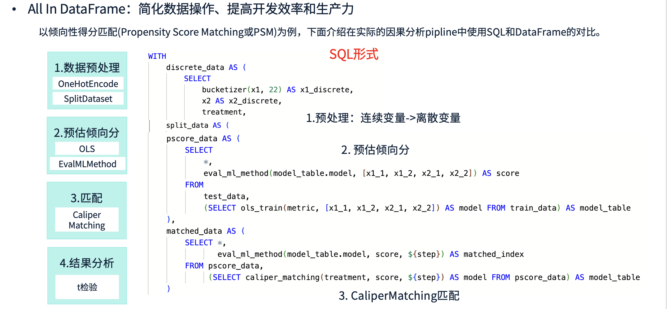 如果使用 SQL 实现该流程,需要构造多个 CTE(公共表表达式),逐层进行处理。例如:先进行数据预处理,再划分训练集,计算倾向性得分,最后进行 t 检验。这种方式虽然可以完成计算,但 SQL 语句较为复杂,不易调试。往往需要运行较长时间后才发现错误,修改和重试的成本较高。