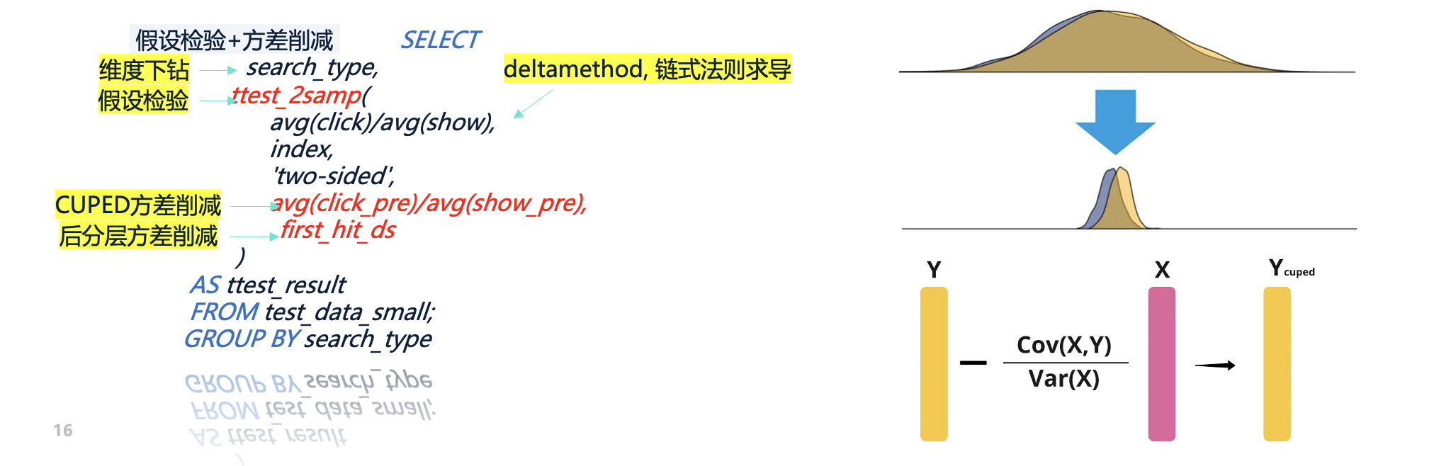 实验分析中的一大挑战在于:指标噪声较大,而策略收益往往较小,导致显著性难以判断。随着实验规模的扩大,这一问题愈发突出。方差削减的核心思想是 利用实验前的协变量(如用户特征、用户标签)降低指标噪声,使得原本波动较大的指标更加稳定,进而提升统计显著性。