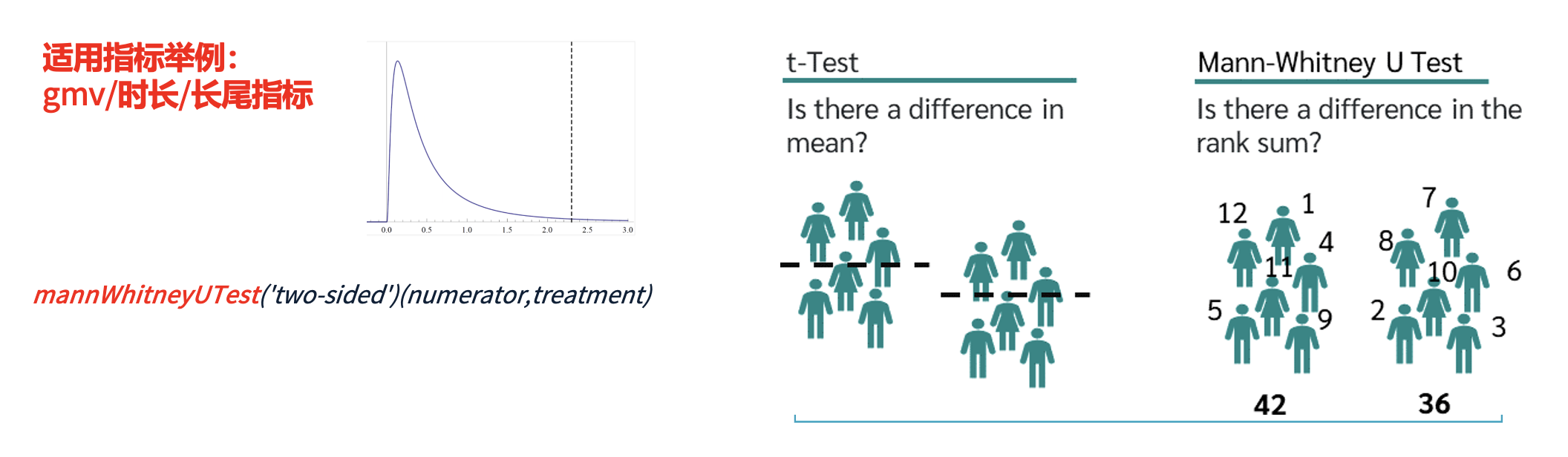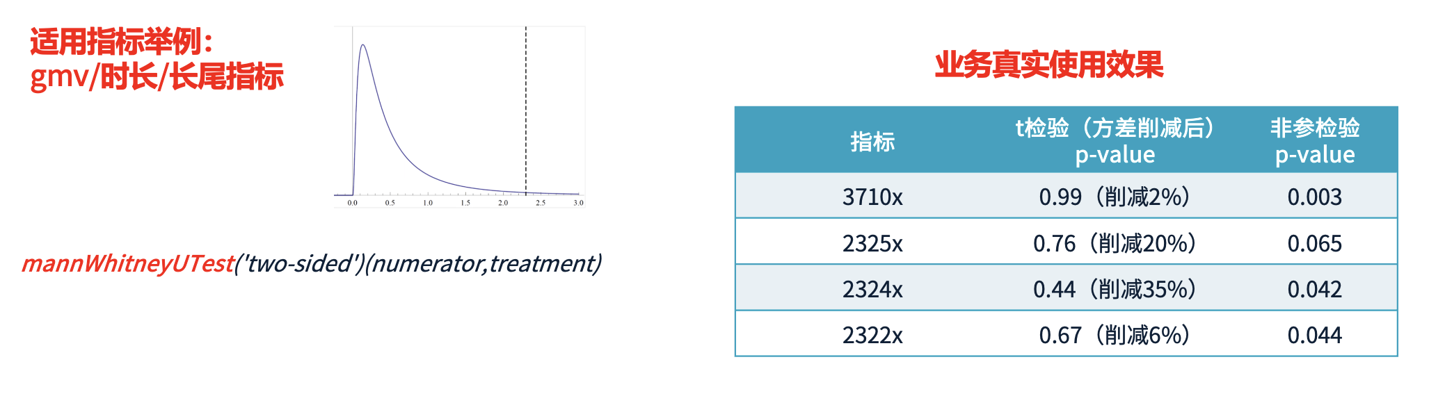 在实验分析中,有些指标呈现长尾分布(如 GMV、用户时长),即: