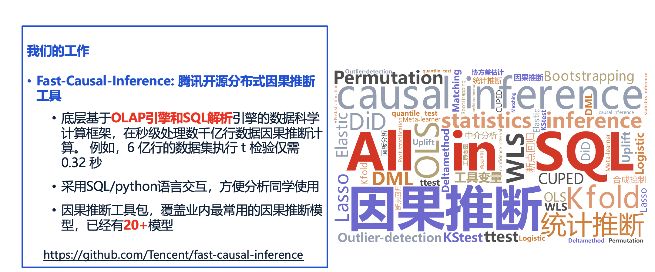 目前,我们的整个项目已经沉淀为一个名为 Fast Causal Inference 的工具包,旨在提供高效的因果推断功能。这个工具包已被开源,用户可以通过 Python 代码进行调用,使用起来非常便捷。同时,为了提升灵活性,我们还提供了类似于 Spark SQL 的 SQL 查询接口。