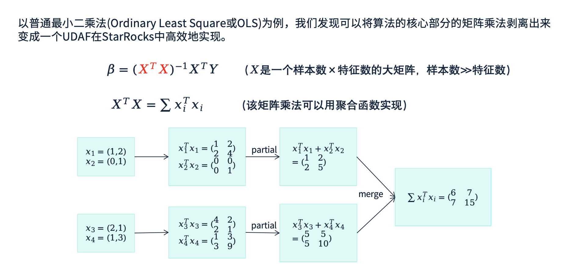 在实现这些因果推断算子的过程中,我们采用了高效的步骤。例如,以 OLS(普通最小二乘法) 为例,我们将核心算法部分(如矩阵乘法)提取出来,作为 UDF 在 StarRocks 中高效实现。以矩阵乘法为例,通过将矩阵的转置与乘法操作优化为聚合函数,能够大大提升计算效率。