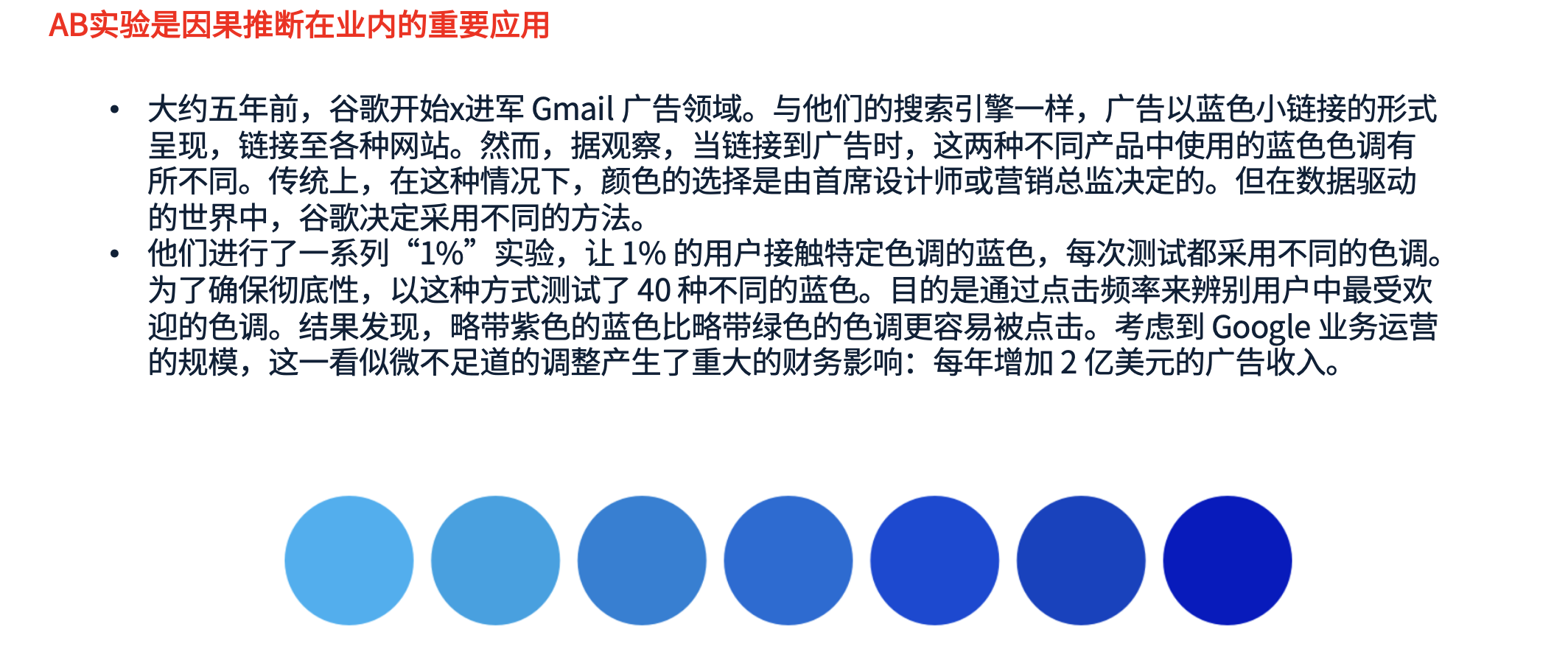 一个经典的例子来自于谷歌的 Gmail 广告优化[2]。最初,谷歌在确定广告中蓝色小链接的颜色时,采用的是传统的方法,即由首席设计师或营销总监拍板决定选用哪种颜色。然而,随着 A/B 测试的引入,谷歌改变了这一做法。他们决定测试 40 种不同的蓝色,来找出哪个蓝色能获得最高的点击率。在实验中,每个颜色方案会被展示给 1% 的用户,经过对比测试,他们最终发现,一种带有轻微紫色调的蓝色,比带有绿色调的蓝色点击率更高。如此细微的调整,竟然为谷歌带来了每年增加2亿美元的广告收入。