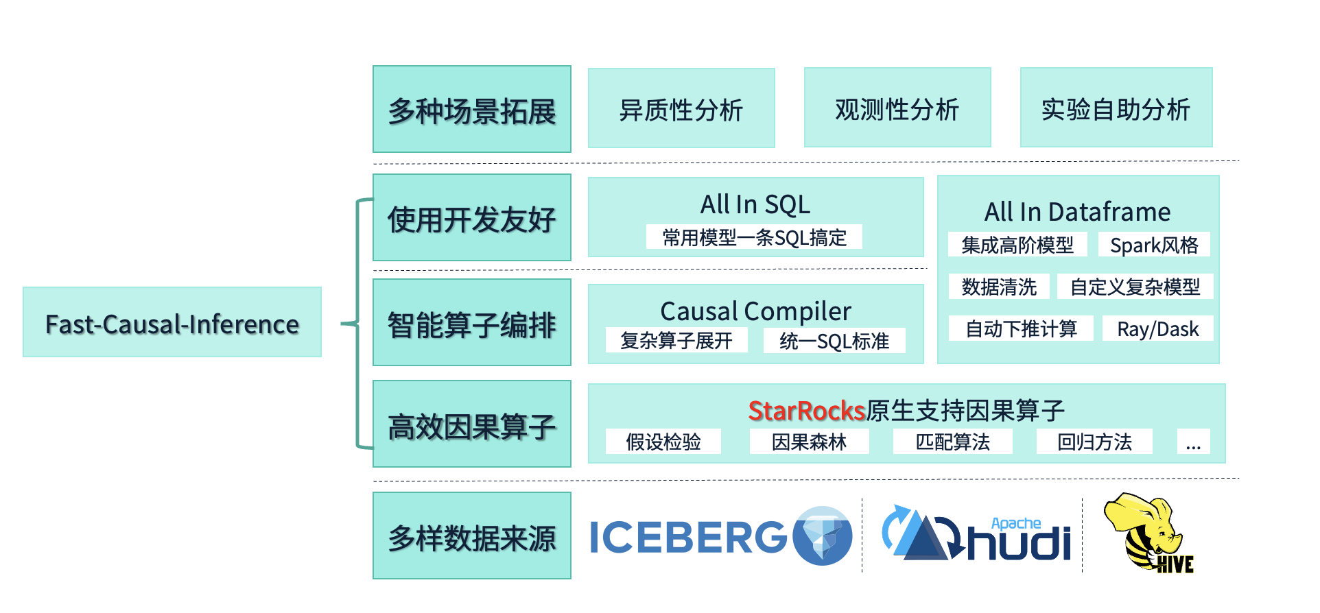基于这些能力,我们打造了 Fast Causal Inference 项目,使得用户能够在各种场景中应用因果推断,例如异质性分析、观测性分析及实验分析等,为数据探索与决策提供强有力的支持。