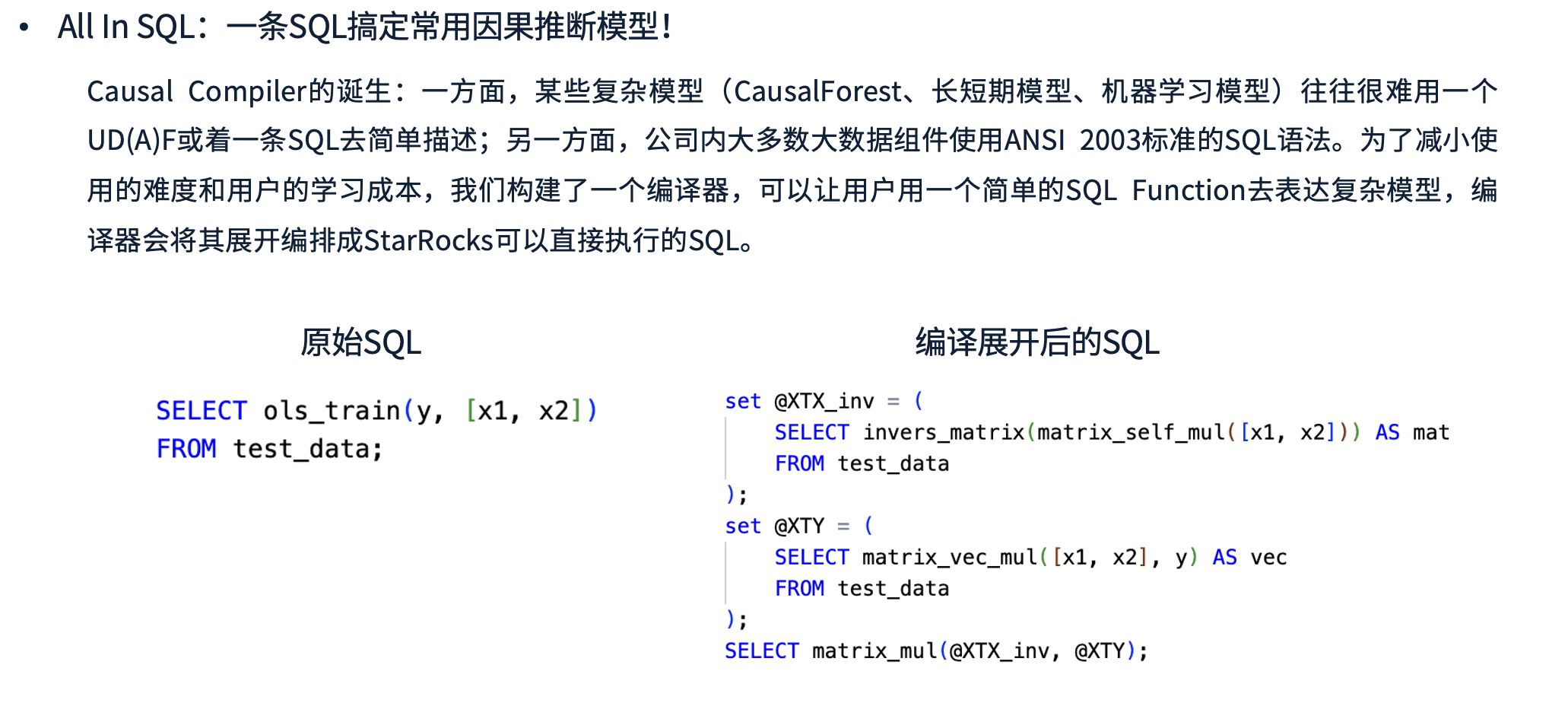 Causal Compiler 负责将用户编写的 SQL 自动展开为 StarRocks 可直接执行的高效 SQL。例如,在 OLS(普通最小二乘法) 训练过程中,编译器会将其拆解为一系列矩阵运算,并最终执行优化后的计算过程。下图展示了该转换的示例。