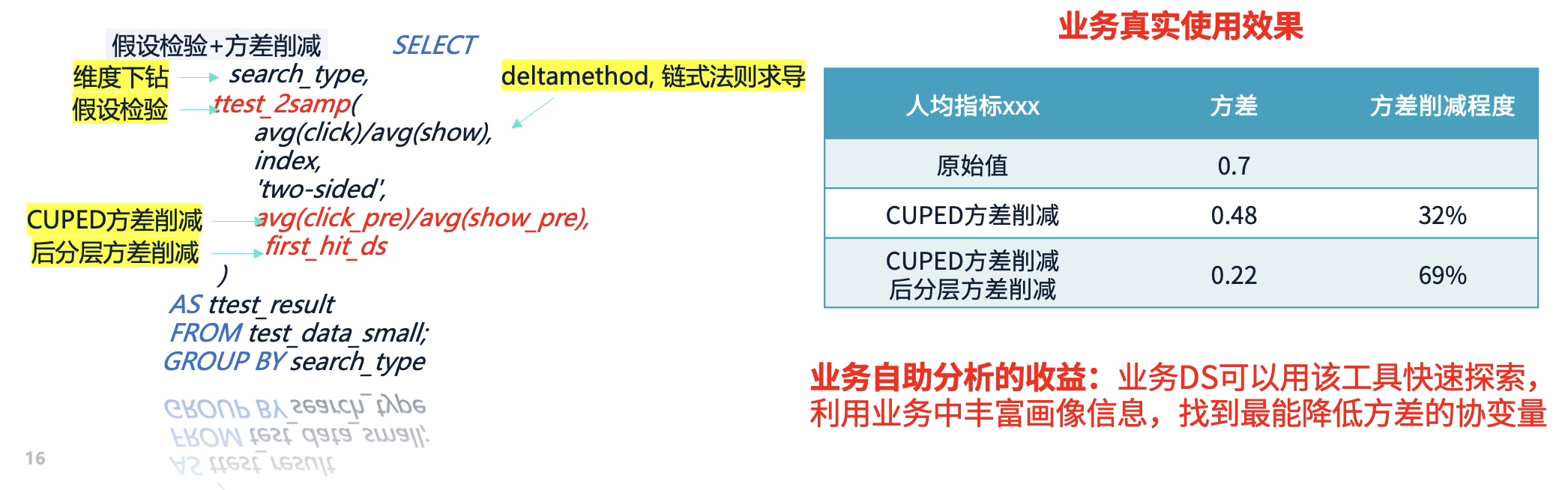 示例: 假设某项人均指标的方差为 0.7,应用方差削减后,方差降至 0.22,显著性的概率大幅提升。