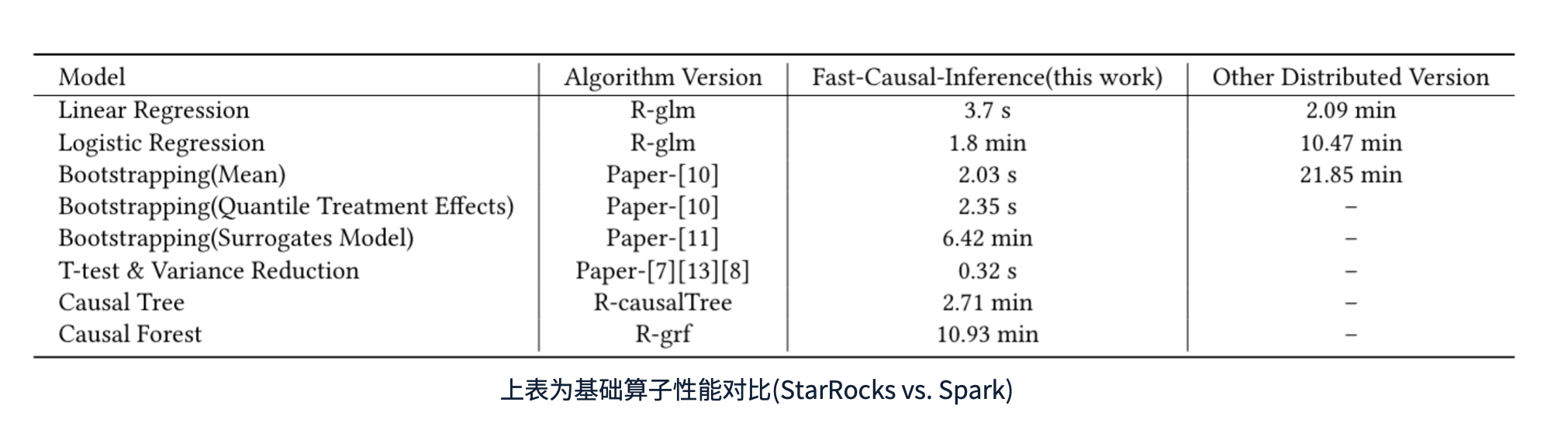 在实现这些因果推断算子后,我们在 StarRocks 上进行了性能测试。下方的表格展示了测试结果,表明我们的 Fast Causal Inference 相较于 Spark 具有显著的性能提升。