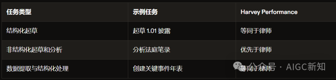 初始基准覆盖三种任务类型:结构化起草、非结构化起草和分析、数据提取和结构化。在所有这些方面,Harvey工作流表现达到或超过人类律师水平,并在常见高价值任务上节省大量时间。