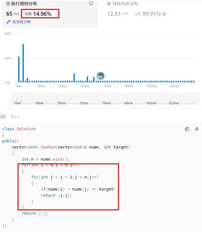 这题的思路很简单,在读完题目之后,便可以想到暴力枚举,直接遍历整个数组两遍即可,但是时间复杂度高,下面是运行之后的结果