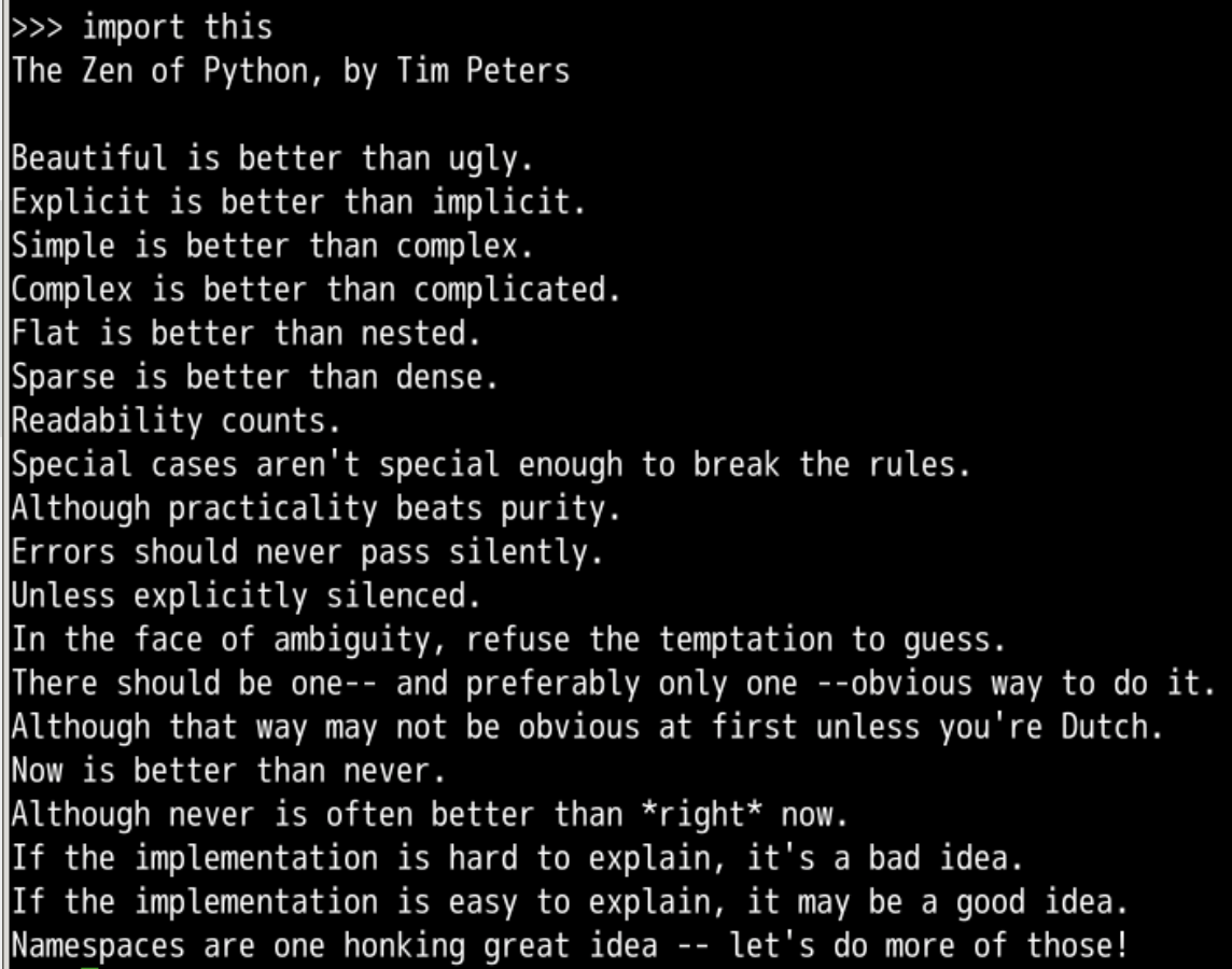 Namespaces are one honking great idea -- let's do more of those! | 命名空间是一种绝妙的理念我们应当多加利用 | 多用名字空间 |