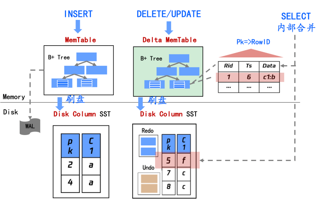 相对于传统的 LSM 存储结构,只读分析引擎的存储系统,为每个磁盘上 SSTable 文件都维护了一个记录增量更新的 Delta MemTable,数据结构和 MemTable 类似。