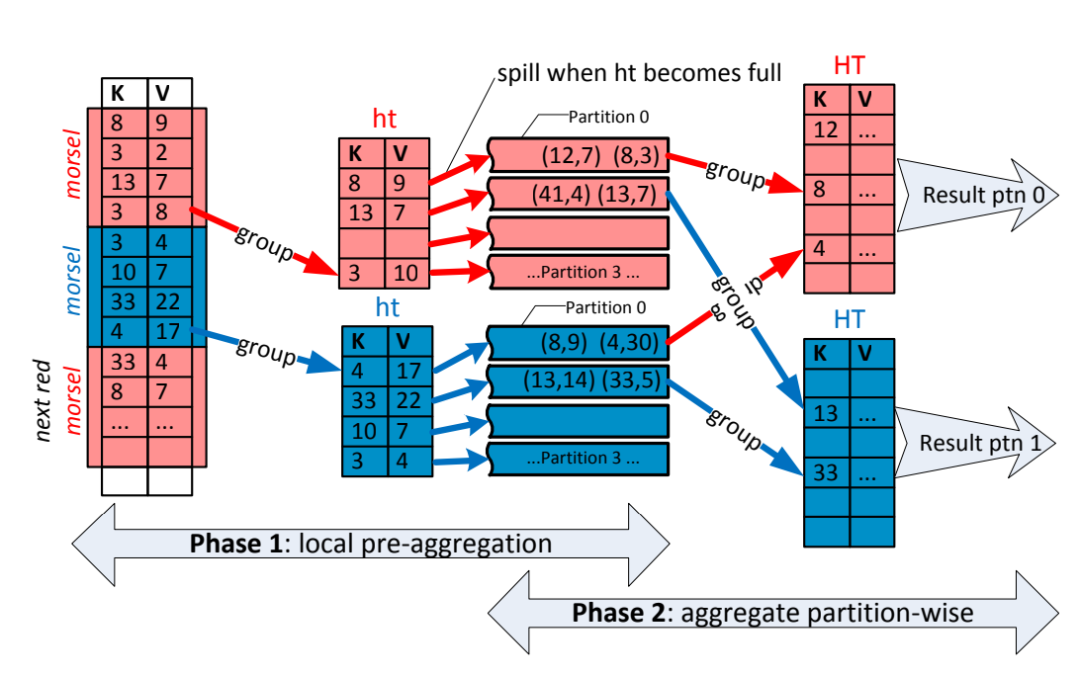 最后是算子的并行以及向量执行,以并行的聚合为例,只读分析引擎的实现基本和论文Morsel-Driven Parallelism一致,通过数据分组以及 Pre-AGG 和 Final-AGG 的拆分可以充分的利用上 CPU 的并行处理能力,提升 SQL 的执行效率,基本原理如下所示: