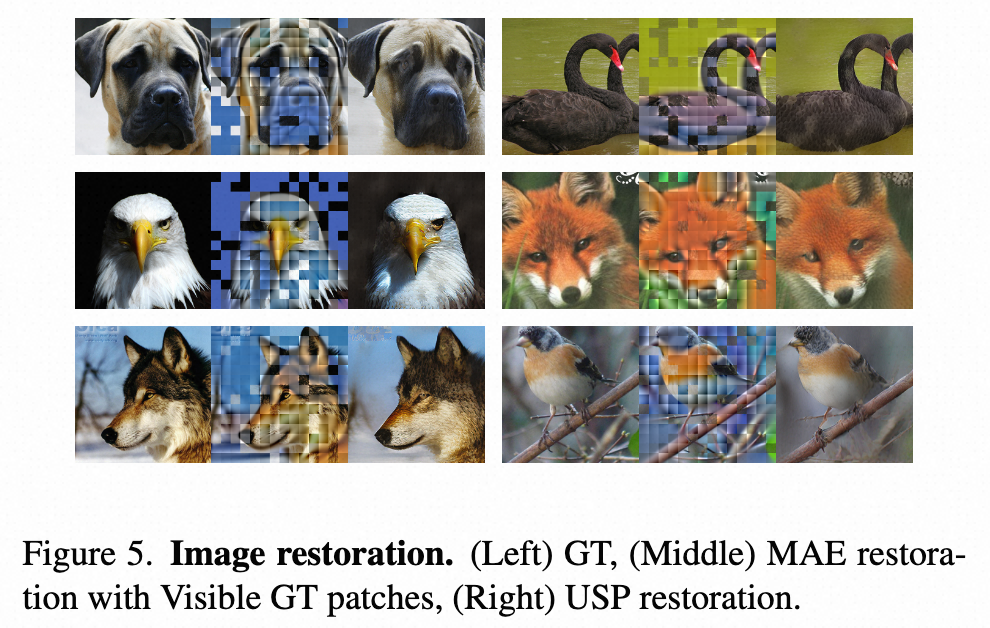 论文中使用经过 800 轮预训练且掩码比例为 0.75 的 ViT-Large 模型研究了图像修复任务。如图 5 所示,USP 在图像修复方面显著优于 MAE,凸显了强表征能力对有效修复的重要性。
