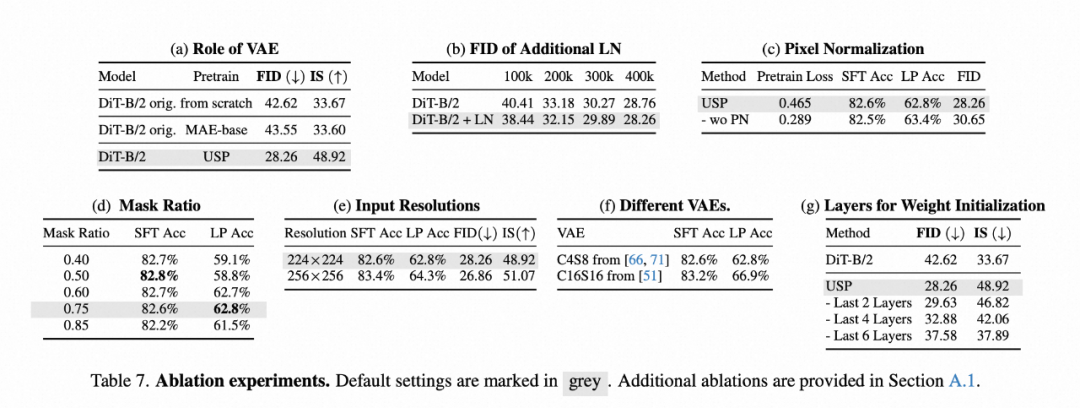研究者进行了全面的消融实验,以探讨 USP 设计中不同组件的影响。例如 VAE、输入分辨率、掩蔽率等。更多的消融实验说明见原论文。