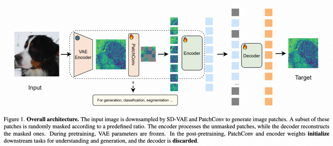 USP 架构基于一个简单的自编码器(Autoencoder),但在 VAE 潜空间中进行操作,而非像素空间。输入图像首先经过 VAE 编码到潜空间,并通过 PatchConv 进行图片分块。部分块按照设定 mask 比例被随机掩码,未掩码的块输入到 ViT 编码器,而解码器负责重建掩码块,损失函数仅使用简单的 MSE loss。在预训练阶段,VAE 参数被冻结,仅训练 ViT 编码器。预训练完成后,ViT 编码器的权重可用于初始化下游任务,如分类、分割和生成。