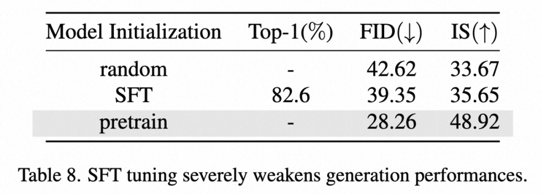 为了实证这一假设,论文中采用了一个监督微调模型,模型在 ImageNet 验证集上的准确率达 82.6%,并使用其初始化 DiT-B/2 进行 400K 步训练。表 8 总结了实验结果。其性能明显低于预训练,进一步验证了对该范式的分析。