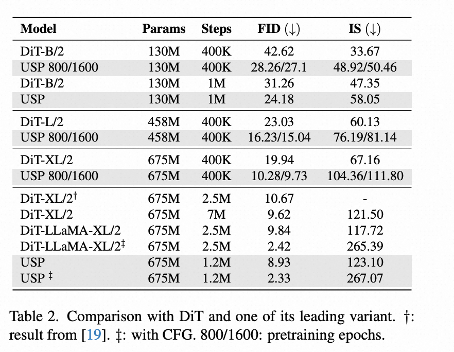 表 2 显示了在不同规模的 DiT 模型上的对比结果。USP 在所有模型规模上均显著提升了生成质量,且随着训练时间延长,生成质量不断提高。相比最近的 DiT 变体在 2.5M 步的 FID,USP 仅在 400K 内就能达到更好的效果。