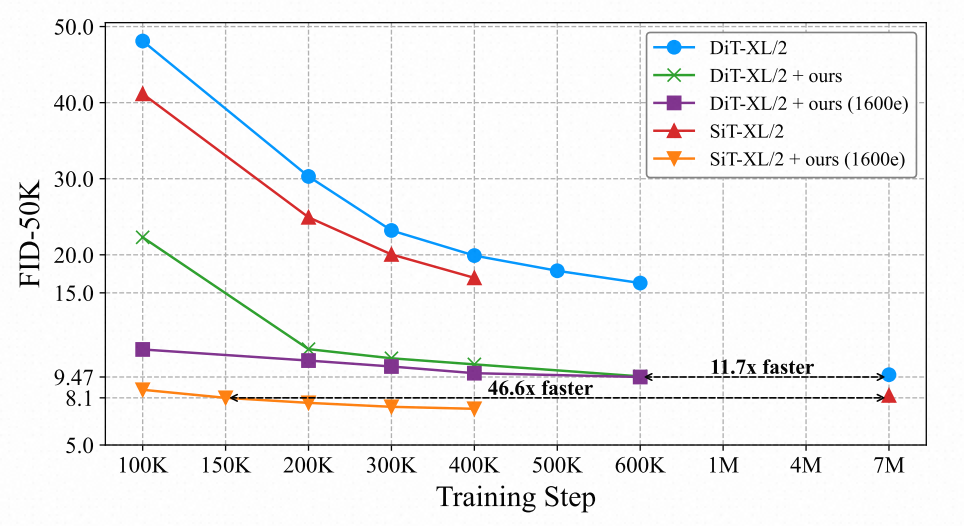 1. 高昂的计算成本:REPA 依赖于 DINOv2 这样的大规模预训练视觉模型,其预训练需要超过 22,000 GPU 小时(A100),计算资源需求极高。