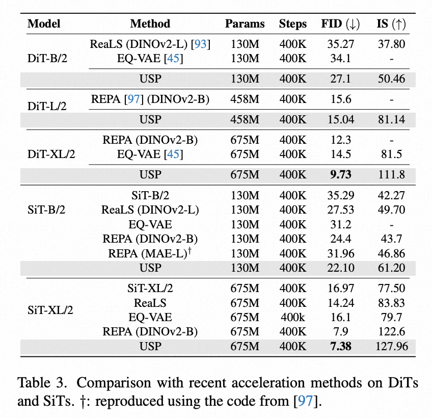 表 3 显示了在不同规模的 SiT 模型上的对比结果。USP 表现出和 DiT 一致的提升效果。同时,表 3 与近期利用表征对齐来提升 DiT/SiT 性能的方法进行了比较,USP 在所有模型设置下均优于其他方法。