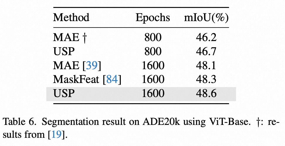进一步,论文在 ADE20 数据集上进行了分割性能评估。表 6 显示了 USP 在单尺度 mIoU 指标上的表现,相比 MAE 提升了 0.5%。