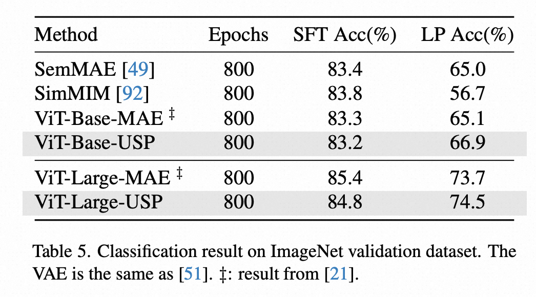 论文在 ImageNet-1k 数据集上进行了线性探测(Linear Probe)和微调(Fine-tuning)的图像分类评估。在线性探测(LP)任务上,USP 的性能优于 MAE;在微调(SFT)任务上,USP 表现与 MAE 相当,表 5 总结了分类结果: