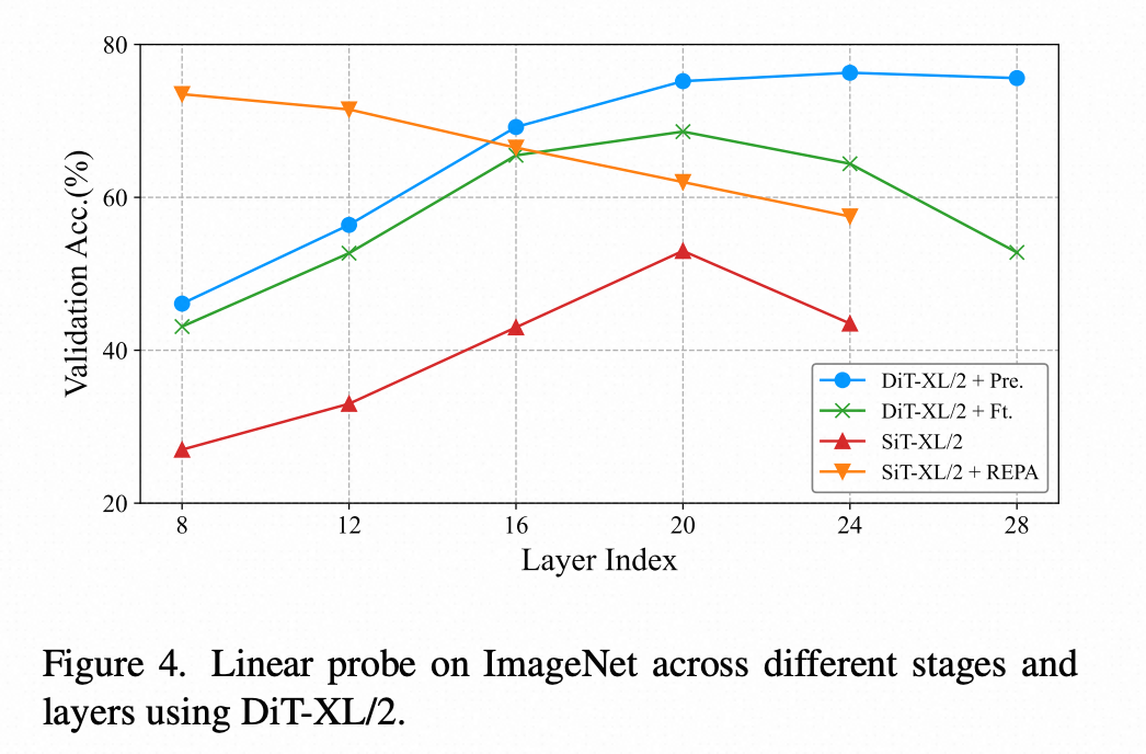 为了更深入地理解 USP,研究者在 DiT-XL/2 训练过程中,对不同层的线性探测性能进行了分析(见图 4)。比较了以下几种情况: