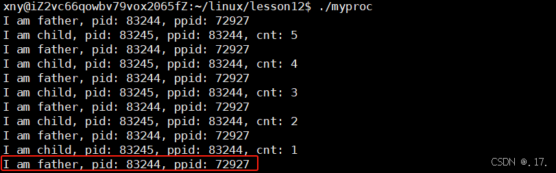 }上面这段代码在 myproc 进程中通过调用 fork 接口创建了一个子进程,子进程在执行完五次打印后就会被终止掉,其中的 exit 函数就是用来终止一个进程,父进程将一直运行。