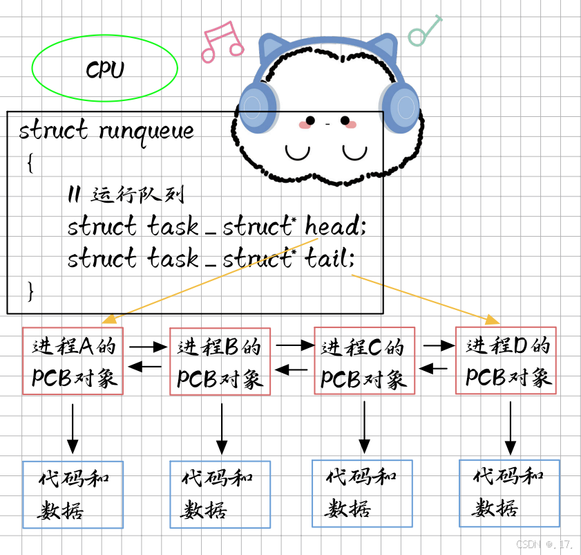 详解:一般的计算机只有一个CPU,但是进程却是有很多个,对 CPU 来说,运行的本质就是被 CPU 调度,所以每个 CPU 都会有一个运行队列,所有的进程要运行都必须在运行队列上排队,而参与排队的是每一个进程对应的PCB 对象