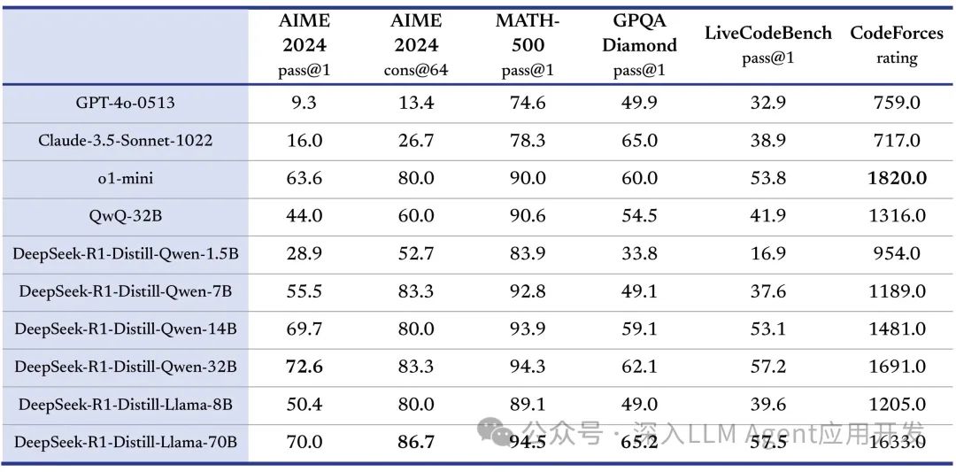 在开源 DeepSeek-R1-Zero 和 DeepSeek-R1 两个 660B 模型的同时,通过 DeepSeek-R1 的输出,蒸馏了 6 个小模型开源给社区,其中 32B 和 70B 模型在多项能力上实现了对标 OpenAI o1-mini 的效果。