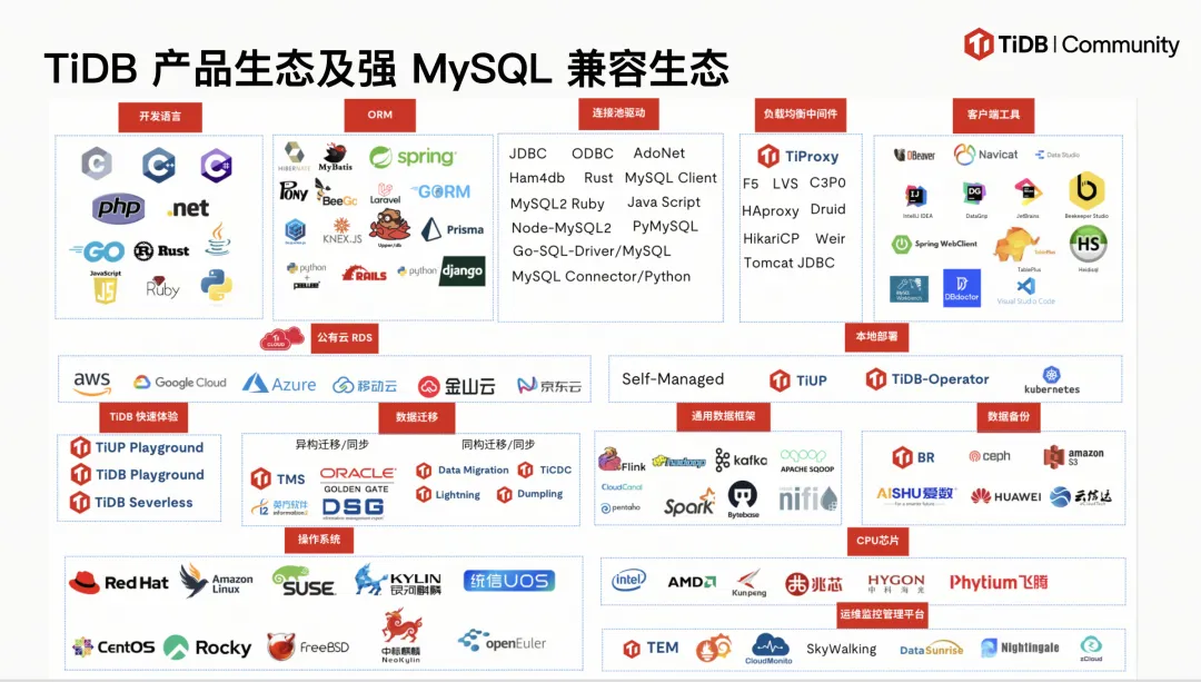 TiDB 提供了强 MySQL 生态。无论是开发语言、ORM、连接池,客户端工具,基本都保持强兼容。同时也提供了最高效的数据导出导入、备份恢复工具,进一步加强了 TiDB 的生态。另一方面,TiDB 和常见的国产操作系统、CPU 芯片都是 100% 兼容,且有生产案例。