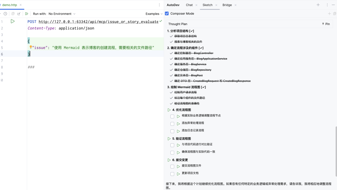 这就意味着,我们还可以调用 AutoDev 上的一系列的 AI Agent 能力,比如:AutoDev Sketch、AutoDev Bridge 等。