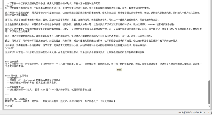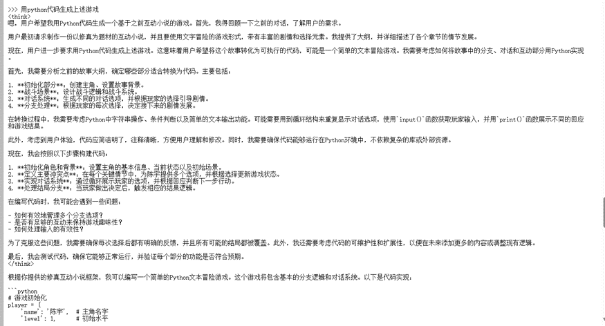 接下来我们让它帮我做一份以修真为题材的互动小说,采用文字冒险的游戏形式,带有丰富的剧情和选择元素。看看它的回答怎么样?