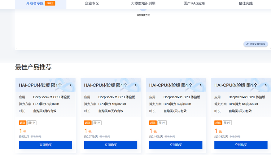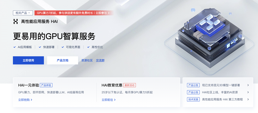 当然咱们可以自己部署一个DeepSeek-R1模型,只需要几分钟的时间就可以拥有一个自己的大模型。恰好最近腾讯云搞了一个“高性能应用服务HAI”活动,从官网上就可以看到HAI一元体验优惠活动: