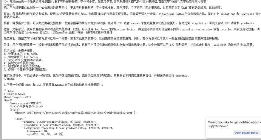 使用html做一个仙侠游戏背景图片,要求有科技神秘感,字体可多变,颜色可多变,文字采用极具霸气的中国水墨风格,首图文字"GAME",文字动态效果为渐变效果,可见Deepseek正在分析我们的需求,并给出了html代码
