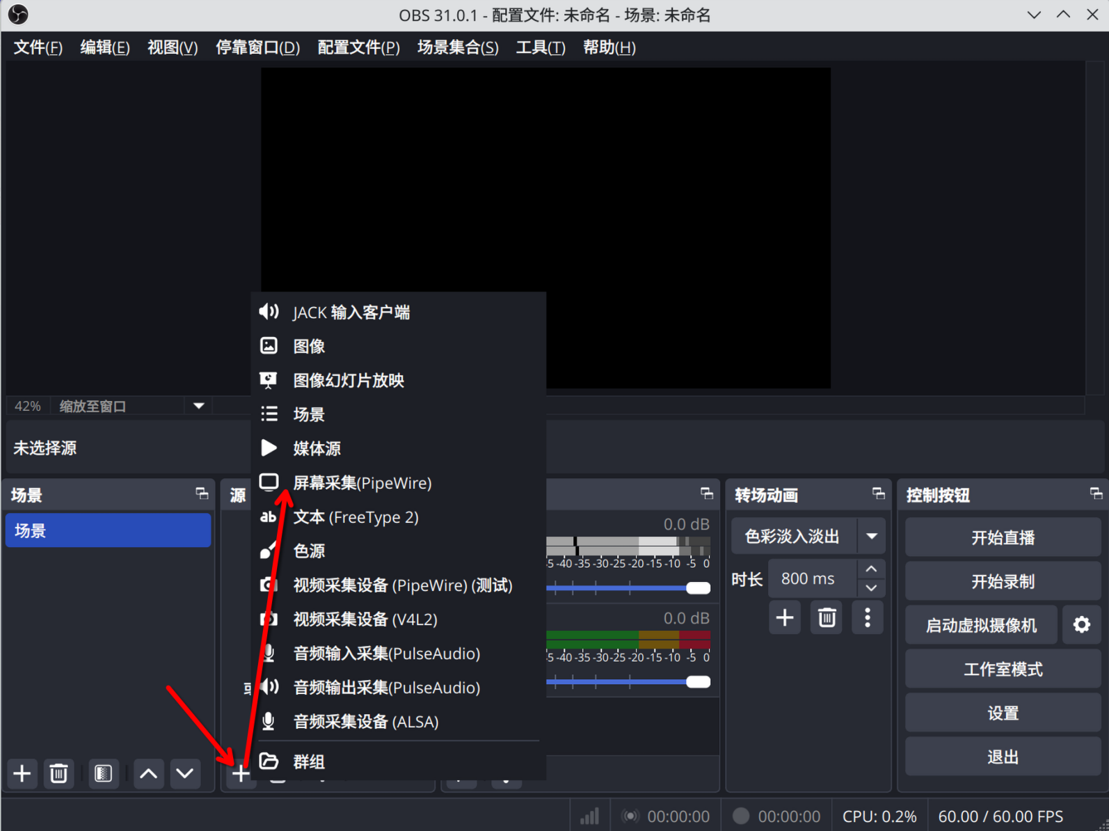 SRS功能丰富,这里只介绍推拉直播流功能。首先我们要准备一个推流工具,建议使用OBS,在官网选择你的操作系统下载即可。点击源中的+可以添加共享的内容,例如我们需要共享屏幕,就点击+-屏幕采集添加一个屏幕采集源。
