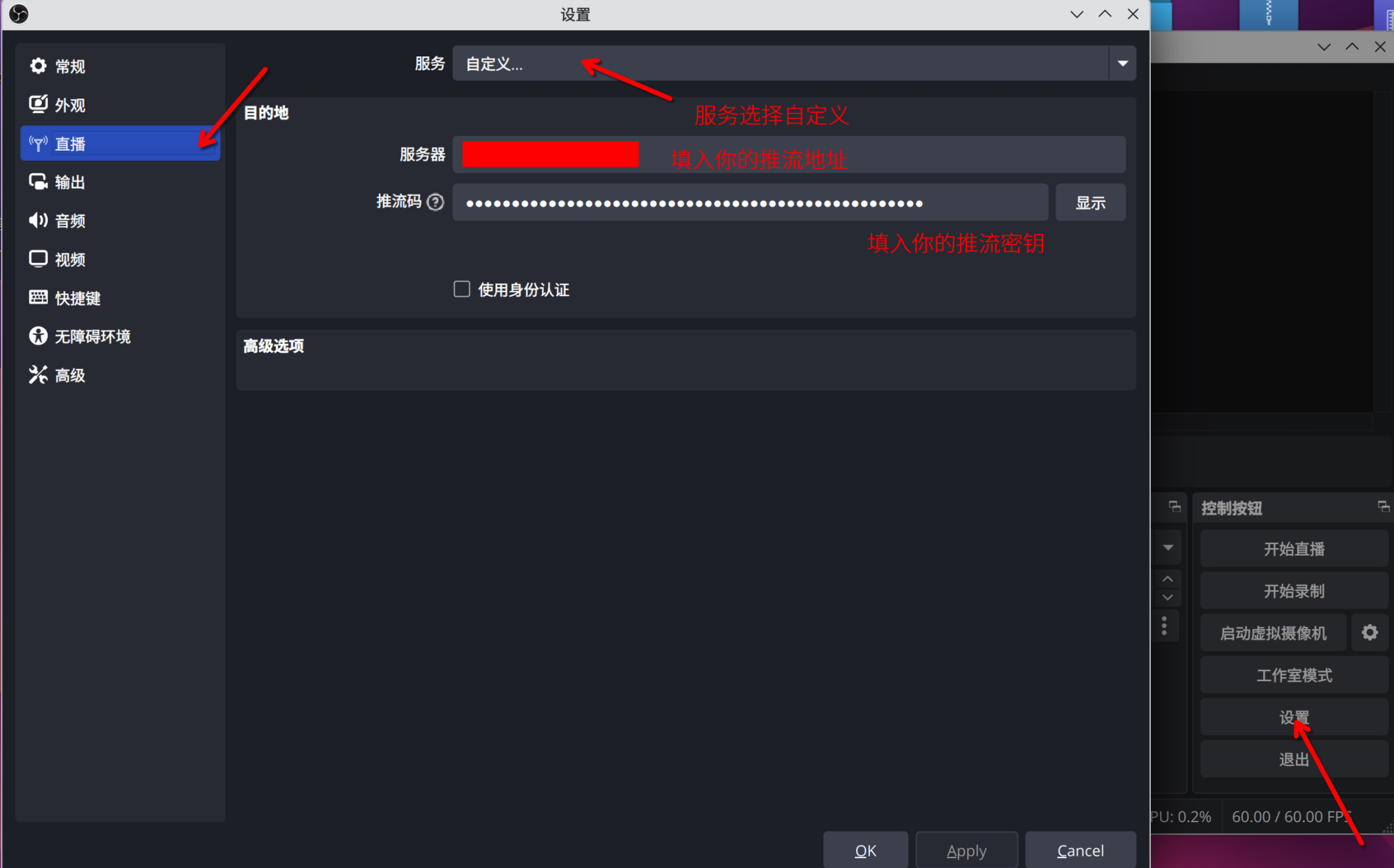 然后点击设置-直播,服务选择自定义,按页面要求设置好推流地址和推流码,点击开始直播即可共享内容。