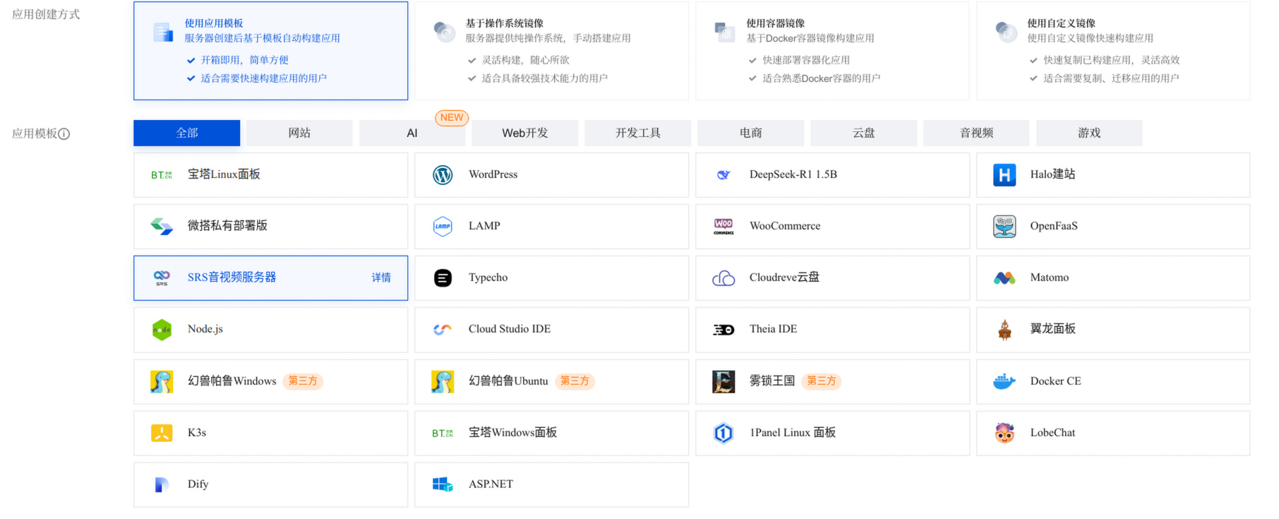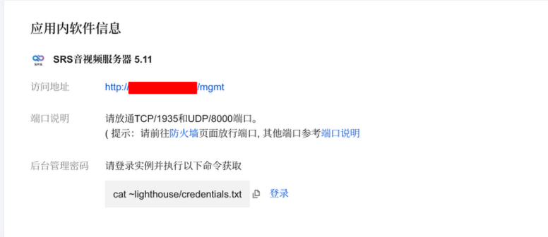 购买完成后,前往控制台便可以看到我们的服务器了。点击我们的服务器,点击应用管理,就可以进入到我们的srs了。服务器配置时已经自动为我们放行了防火墙的必须端口,我们无须再做其他配置就可以进入srs。初次使用的时候需要设置密码。
