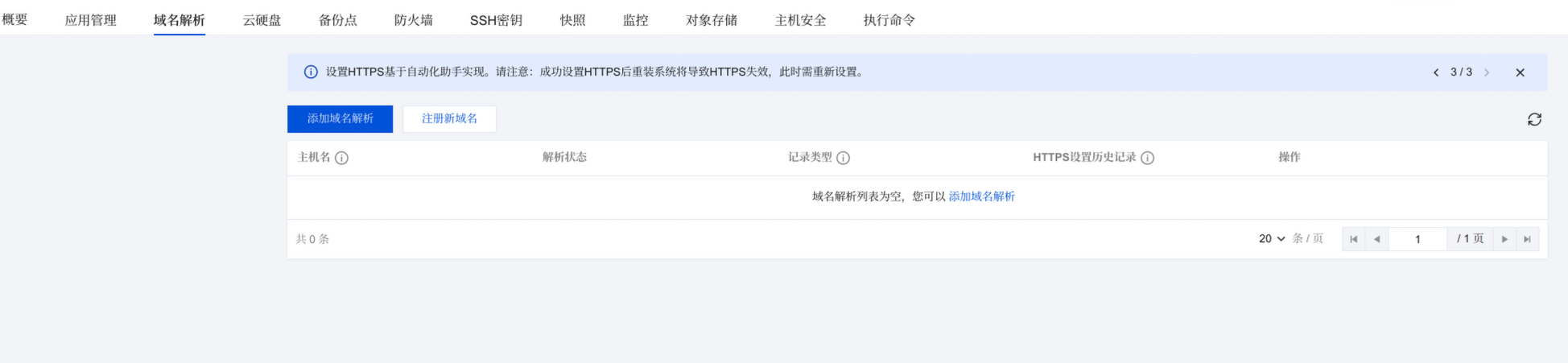 为了我们的服务器有个好记的名字,我们需要准备一个域名。这里我已经提前准备好了一个,我们点击域名解析-添加域名解析来添加一个域名。如果你的域名托管在DnsPod的话会帮你自动添加这条解析,如果你的域名是其他地方买的,还需要去添加一下解析。