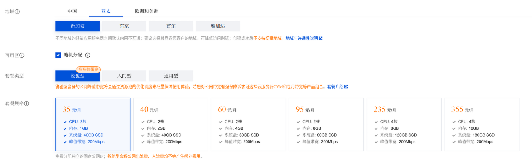 在本教程中,我们使用新加坡地域的SRS音视频服务器镜像锐驰型套餐2核1G配置。其他内容无须变动,直接购买即可。