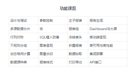 报表功能:使用基础报表(产品版本中的报表版)可以满足绝大多数用户对报表的功能期望,而这部分“基础”功能涵盖了市面上主流报表产品的绝大部分核心功能,包括一些高级企业级功能。