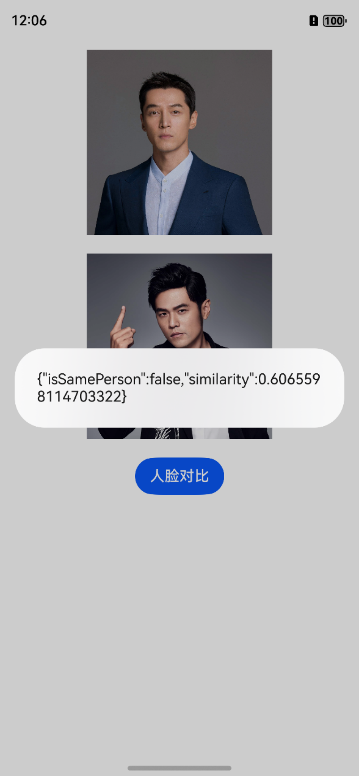 这是一个基于AI基础视觉服务实现的人脸对比案例,通过调用设备相册选择两张图片进行人脸特征比对,并展示相似度计算结果。