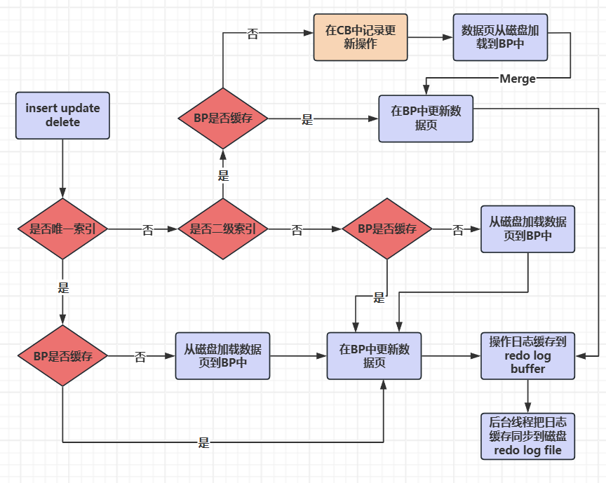 如果不是唯一索引页,且是二级索引页,就需要判断当前这个二级索引页在BufferPool中有没有缓存。如果有缓存,就直接在BufferPool上更新。如果没有缓存。就先把变更操作包括insert,update,delete等先记录到ChangeBuffer中。等这个二级索引页从磁盘加载到BufferPool中的时候,在去执行一个merge操作。完成对数据页的更新。