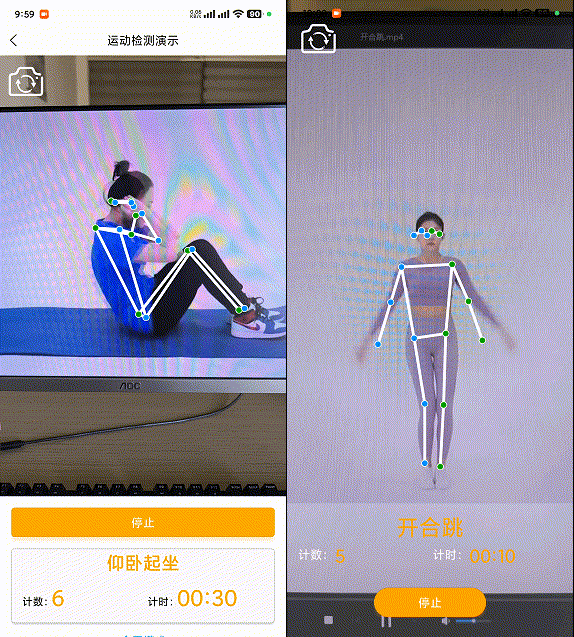 通过前几篇博文,您已经可以通过插件在APP上进行抽帧、人体检测了,在获得到人体结构后,便可以进行运行分析实现人体计时计数了,uniAPP插件同微信小程序一样,仍然内置了跳绳、开合跳、俯卧撑、仰卧起坐、深蹲(深蹲起)、平板支撑、马步蹲等多个常见运动,可以满足健身、线上赛事、学生体测等场景需求,若有个性运动定制需求,也可以使用插件提供的pose-calc姿态分析检测接口,进行自定义扩展,后续章节再向您介绍。