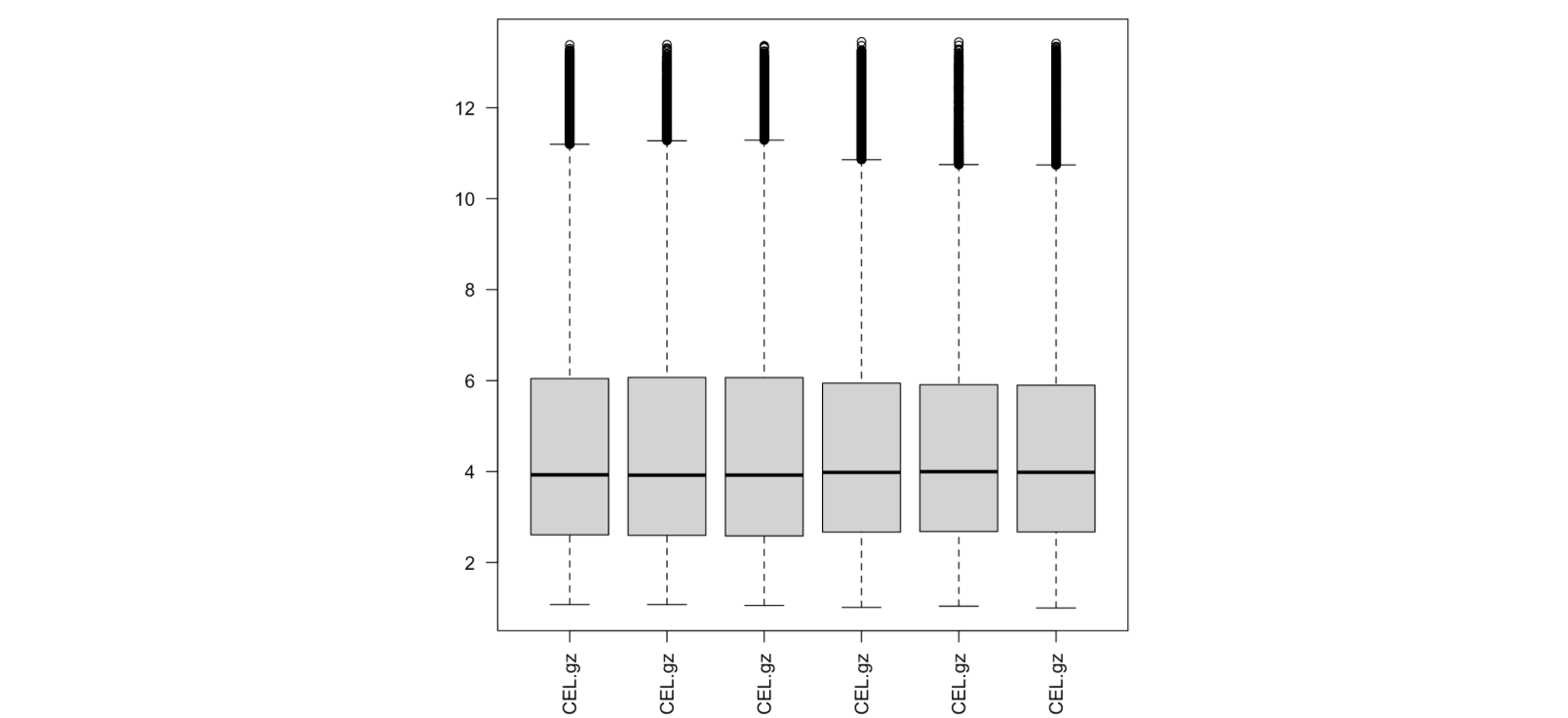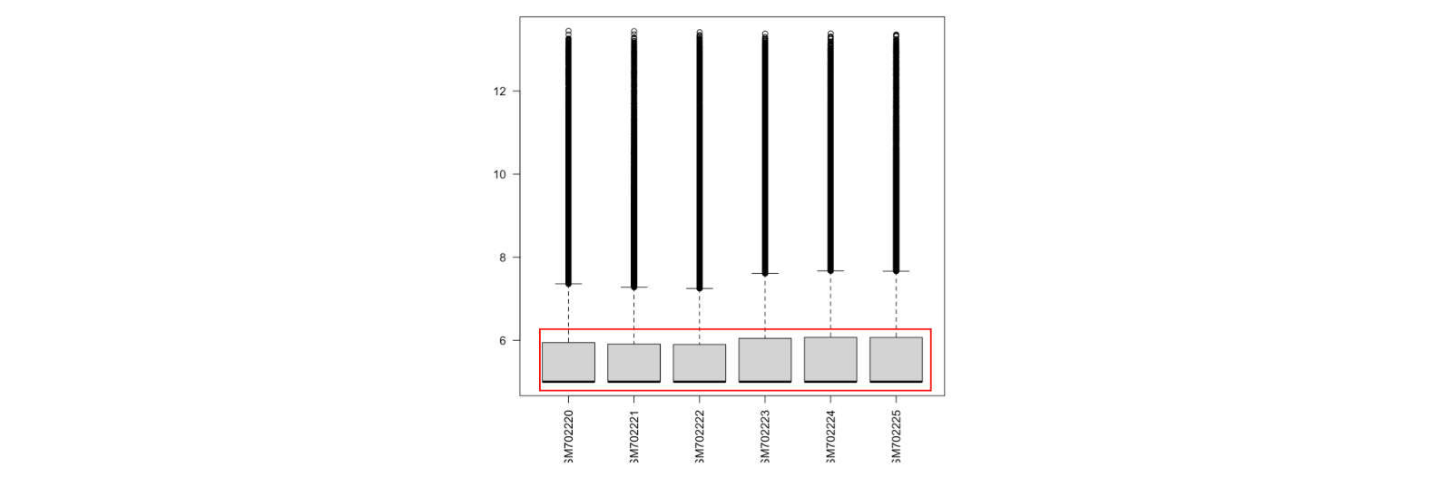 boxplot(exp,las = 2) #看是否有异常样本可见该矩阵的表达范围是5.000 13.449,证明已经log过,不需要再log的操作了,但是箱线图确实特别奇怪,即他的中位数和四分之一位数是重叠在一起的,然后我查看了这个数据的其他分位数,发现最小值,中位数,四分之一位数都是一样的。