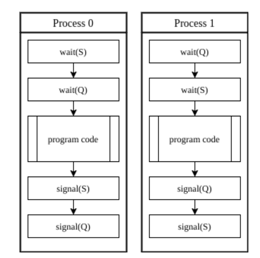 考虑一种情况,即Process 0执行 wait(S) 并在此之后立即中断。然后让我们假设Process 1开始运行。最初,在信号量上等待Q,Process 1然后在 wait(S) 语句上被阻止,因此它进入睡眠状态。
