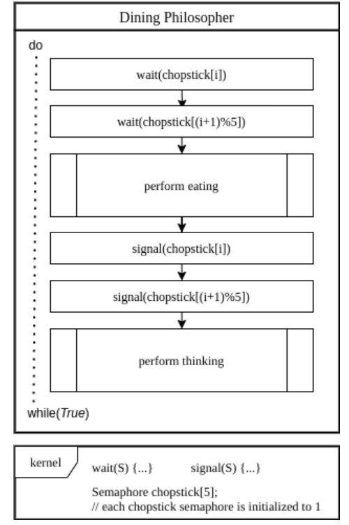 在这个解决方案中,当哲学家i决定吃东西时,它首先等待信号量i。然后在获得它之后,哲学家等待信号量(i+1)%5。当两根筷子都拿到了,它就可以吃了。