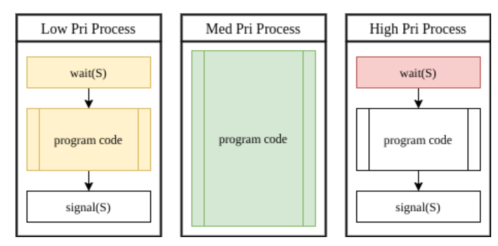 假设一个低优先级进程持有一个信号量,这是高优先级进程所需要的。此外,假设中等优先级进程也在调度程序队列中等待: