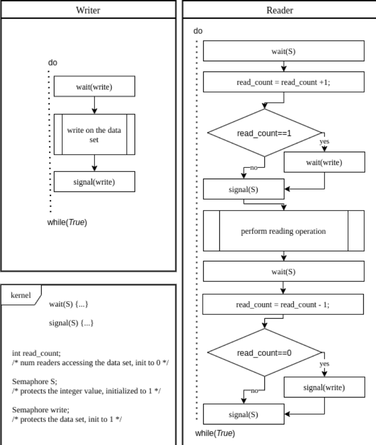 如果当前没有其他reader正在访问该数据集,则在增量操作之后,read_count变为1。在这种情况下,reader在访问数据集之前等待信号量写入,以确保没有writer正在访问。在释放信号量S之后,reader继续执行读取操作。