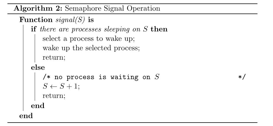 如果没有其他进程正在等待资源,则signal操作将递增 S。否则,不会增加其值,而是选择等待进程由操作系统调度程序唤醒。因此,该进程将获得对资源的控制。